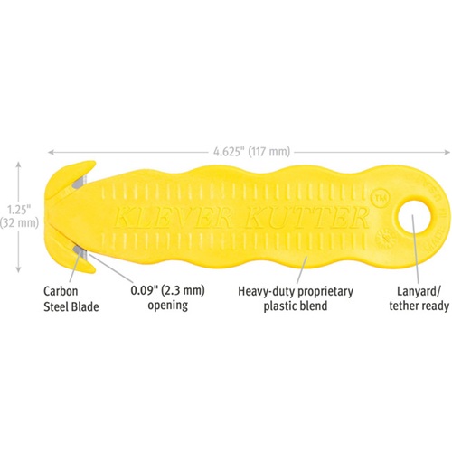Klever cutter / kutter, veilig mes om verpakkingen open te snijden, zonder kans om in het mes te grijpen. Dit is een wegwerp artikel, dus als de "2" messen bot zijn, weer een compleet nieuw exemplaar gaan gebruiken. VEILIG. Quick & Safe. Handige dozen opener met mes. Toepassing; Karton, folie, plastic, strap, band, tape enz. Clever cutter. Lengte 12cm x breedte 32mm x dikte 4mm, kleur zwart kunststof lemmet, met metalen mesjes om dozen te openen. Made in USA. Komen momenteel in verschillende wisselende kleuren bij ons binnen.