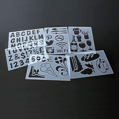 Sjablonen - set van 5 stuks voor het werken met krijtstiften en andere markers. Cijfer- en letterhoogte 6 cm. Figuren 15-17 cm hoogte. Afmeting per stencil 37x23,5cm Letters en cijfers, afbeeldingen, ijsje, wijn, koffie, chocomelk, drinkglas, gebakje, taart, druiven, broojes, bestek, verboden te roken, WiFi, Facebook, Pinterest, Twitter, Instagram.