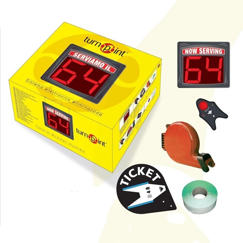 TurnoPoint volgnummerdisplay kit met draadloze afstandbediening, rode dispenser met wandhouder, en 1 volgnummerrol. Afmetingen nummerdisplay: ca. 27,5 cm (b) x 24 cm (h) x 3 tot 7,5 cm (d) Afmetingen ledcijfers : ca. 21 cm (b) x 14,85 cm (h). Nummering loopt telkens met 1 nummer op. De Easyturn heeft 3 verschillende tonen + mogelijkheid om geluid uit te zetten. Er is geen volume instelling. Minipoint. Samenstelling: - Volgnummerdisplay - 2-cijferige weergave - Voedingsstekker - Draadloze afstandbediening / TX radiografisch - Etiket: Now serving - Bord: TICKET - Dispenser voor wandmontage - 1 Volgnummer rol met 2.000 tickets