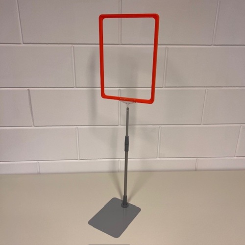 Standaard A4 oranje raam met transparant T-stuk, verstelbare aluminium buis en metalen grijze voetplaat. Verstelbaar/ uitschuifbaar van 32 tot 58 cm. Dit is voor ons een samengesteld artikelnummer uit 4 andere artikelnummers. Bij >Gerelateerde artikelen< kunt u de huidige voorraad zien. Verkoopprijs € 11,77 excl.btw.