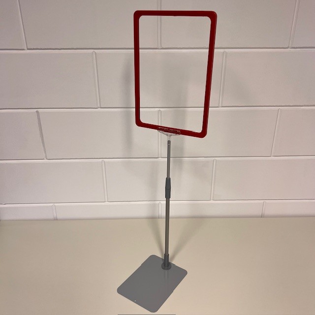 Standaard A4 rood raam met transparant T-stuk, verstelbare aluminium buis en metalen grijze voetplaat. Verstelbaar/ uitschuifbaar van 32 tot 58 cm. Dit is voor ons een samengesteld artikelnummer uit 4 andere artikelnummers. Bij >Gerelateerde artikelen< kunt u de huidige voorraad zien. Verkoopprijs € 11,77 excl.btw.