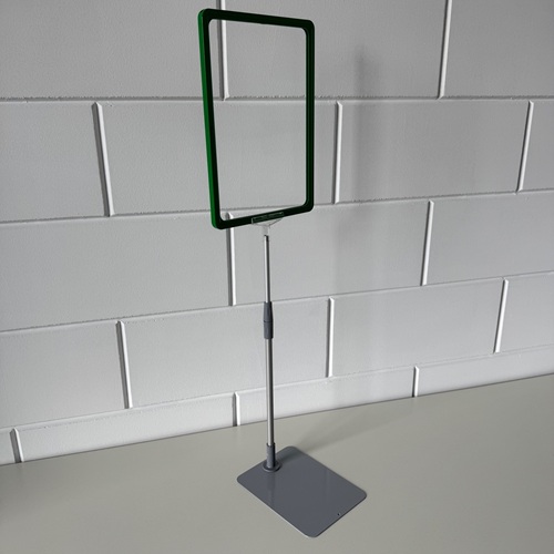 Standaard A4 groen raam met transparant T-stuk, verstelbare aluminium buis en metalen grijze voetplaat. Verstelbaar/ uitschuifbaar van 32 tot 58 cm. Dit is voor ons een samengesteld artikelnummer uit 4 andere artikelnummers. Bij >Gerelateerde artikelen< kunt u de huidige voorraad zien. Verkoopprijs € 11,77 excl.btw.