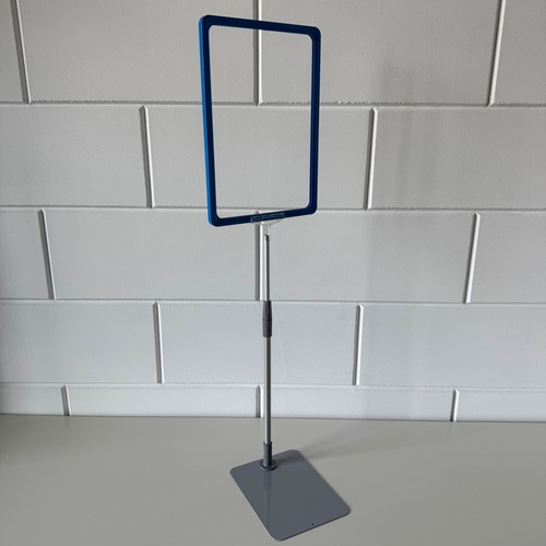 Standaard A4 blauw raam met transparant T-stuk, verstelbare aluminium buis en metalen grijze voetplaat. Verstelbaar/ uitschuifbaar van 32 tot 58 cm. Dit is voor ons een samengesteld artikelnummer uit 4 andere artikelnummers. Bij >Gerelateerde artikelen< kunt u de huidige voorraad zien. Verkoopprijs € 11,77 excl.btw.