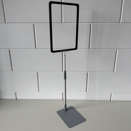 Standaard A4 zwart raam met transparant T-stuk, verstelbare aluminium buis en metalen grijze voetplaat. Verstelbaar/ uitschuifbaar van 32 tot 58 cm. Dit is voor ons een samengesteld artikelnummer uit 4 andere artikelnummers. Bij >Gerelateerde artikelen< kunt u de huidige voorraad zien. Verkoopprijs € 11,77 excl.btw.