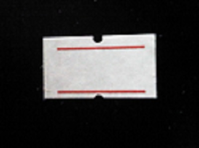 Etiket 2112 wit met 2 rode strepen permanent met gaatje tussen de etiketten, etiketten aan de buitenzijde op de rol, doosinhoud 50 rollen à 1000 etiketten (=50.000) voor Hallo/Etimark/Samark/Herlitz. Wordt soms ook als afmeting 22x12 verkocht. FSC®-C095147