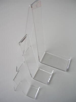Acryl-standaard voor lederwaren hoogte 12cm vuldiepte 4,5cm, totale diepte 10cm en breedte 4cm.