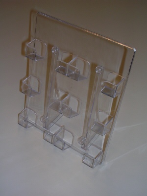 Telefoonkaarthouder 6-vaks - creditcard-formaat. Kan vlak aan de muur worden gehangen. Afmeting bxh 216x250x35 mm. Visitekaarthouder 6 vakken. Enkel nog als wandmodel leverbaar.
